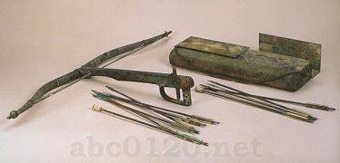 銅弩(いしゆみ)は弓と弩臂(矢をつがえる軸の部分)からできている。弩臂の先端部分にはくぼみがあり、そこに弓をはめこむ構造になっている。弓と弦の間には矢を射った後に弦の反動を軽減させるために縄が張られている。弩臂の末端には弓を飛ばす弩機が装着され、現在のボーガンのように射る。撃ち方は(図)の兵馬俑のようであり、(図)の画像石の遊牧民に見られる、騎馬上から射るものとは異なる。一号銅車馬で、弩は御者の前に、箙は足もとに大切に置かれていた。このほか盾も装備されており、馬を操作する一方で時には攻撃にも備えなければならなかった。出所:「世界四大文明・中国文明展」