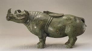 動物を象った尊は、段(商)同時代の長江中流域で多く出土しているが、漢代の出土は稀である。犀の背には蓋があり、口の右側には管状の注ぎ口がある。腹のひだと背中の蓋を、鞍と腹帯に見立てている。全身に金銀の象嵌で雲流文が施され、両目には黒光りするガラス玉がはめ込まれている。アジアに生息するニ角犀は、スマトラ犀であろう。繊維質の犀の角は薬用に、皮は鎧に利用された。出所:「世界四大文明・中国文明展」