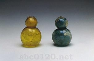 一点は黄色透明、表面に光沢がある。もう一点は緑色透明、外壁に白い風化層がある。形はともにひょうたん形で、口縁部の仕上げは粗雑で、器壁はわりに薄い。型無し吹きガラスによる成形。分析によると、鉛ガラスで中国製である。出所:『中国の金銀ガラス展』