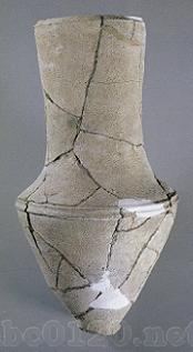 三星堆遺跡出土 陶器 高52.6cm 腹径27.2cm 口径18.1cm 三星堆博物館 頸部が長く、腰の部分に2本の凸帯をめぐらせた灰陶の壺。やはり底部は平らで、小さい。出所:『三星堆』