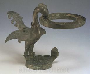 これは劉勝の妻、竇綰の墓に納められていた明りである。とぐろを巻いた龍を踏みしめた鳥がドーナツ形の皿を銜えている。鳥は鶏冠をもち翼と尾が枝分かれしていて、空想的な姿に表わされている。皿の中は3つに仕切られ、それぞれに灯心を立てる突起が付いているので、3か所同時に火を灯すことができる。 出所:「中国国宝展」