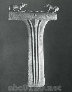 ソケット部には,太陽文,S字形雲文,鋸歯文が鋳出されている。ソケットの背には虎と猪がのっている。両者は牙をむきだして向いあっており,生き生きとしたそのさまは,これから展開されようとしている一場の残酷な格闘を暗示している。2匹の足下には,頭と尾をそれぞれ逆に向けた2匹の蛇がからみあっている。蛇はどちらも鎌首をもたげて,それぞれ猪と虎を注視し,すきあらば襲いかかろうとしている。このような文様が華美で装飾が施こされている武器は,戦闘の実用武器ではなく,滇王族の儀仗部隊が使用していた儀式用の装飾的武器とすべきであろう。出所:「雲南博物館青銅器展」