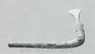儀式用武器。まずソケットが楕円形で,刃部が弓形の斧を鋳造し,それに湾曲した青銅製の柄をとりつけたもの。斧のソケット部は,雷文と縄文で装飾され,柄の湾出したところには,円形のボタン形の文様とジグザグ文がある。この種の斧を通して,その他の斧を柄に装着する方法もはっきりと理解することができる。出所:「雲南博物館青銅器展」