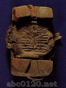 漢代の木簡には検(または木梜ともよぶ)というものがついており,それに紐をまき,粘上を押し込んで固く封じ,その上に文章を書いた人の印が捺してある。これは書かれたものが本人のものであることを証明するためのものである。これは居延右尉が文を発し,封泥したのちにのこされた印鑑と封検である。そこにまきつけた麻紐ものこっている。出所:「シルクロード文物展」
