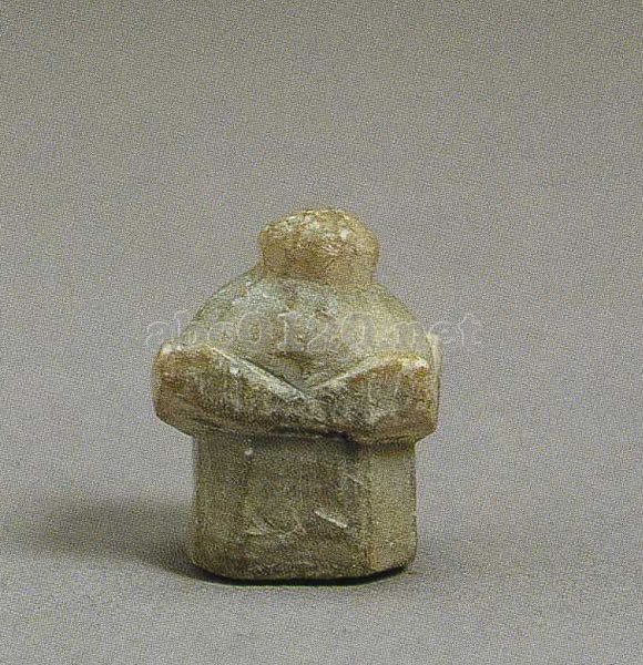 北宋 10世紀 高さ2.1cm 小さな滑石製の宝塔。下を8角に面取りし、上は屋根形につくり、項部には室珠がつく。ごく小さなもので、素材も玉ではなく滑石で、質のよくないものである。用途、年代についてははっきりとしない。単体で塔形のミニチュアなのか、もしくは他の器の鈕のようなものかもしれない。出所:『地下宮殿の遺宝中国河北省定州北宋塔基出土文物展』