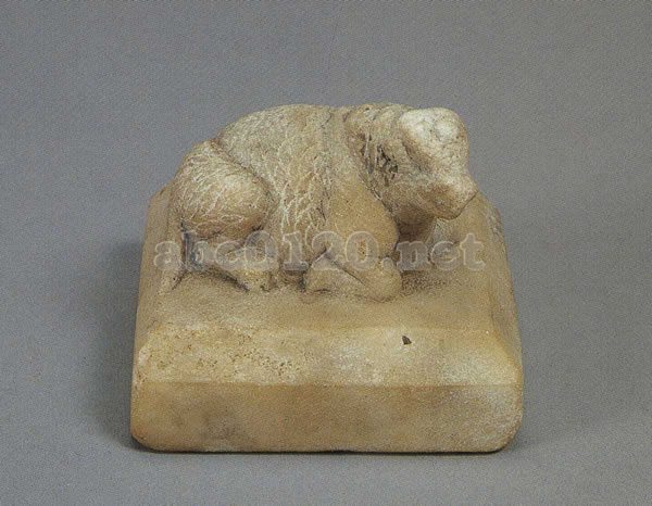 北宋 10世紀 高さ5.5cm 大理石製。方形の台座に羊を彫り出した彫刻。台座の上辺は斜めに切られている。羊は前・後脚を折りまげた姿勢。鎮もしくは祭礼用の器物として用いられたものか。出所:『地下宮殿の遺宝中国河北省定州北宋塔基出土文物展』