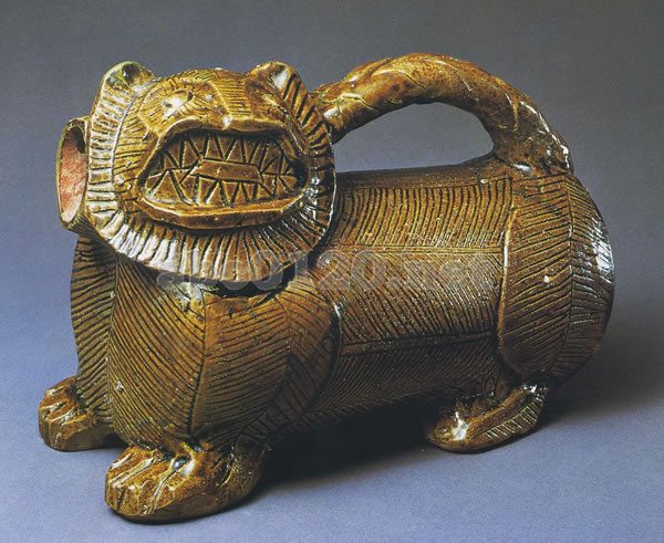 漢代の画像石と工芸品 紀元前206~西暦220年 1973年新沂県唐店出土 高さ28.Ocm 長さ25.Ocm 幅13.Ocm 釉をかけた虎形の容器。身を伏せ左を向き,口を開けた虎形の容器で,耳下が器口となっている。振り上げた尾は頭部に連なり把手になる。全身に黄緑色の釉を掛け,羽毛が浅刻されている。出所:『南京博物院展』1981