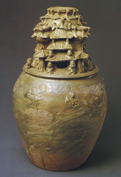 飛鳥,人物で飾った青磁の壺。副葬用の明器。灰白色地に灰青色の紬のかかったもの。上部は四つの小型盂と一つの大型盂から成る。中央の大型孟は罐に通じ,その周りに楼閣,人物.飛鳥、走獣などが貼りつけられている。腹部には飛鳳,辟邪(邪霊をはらう想像上の獣)などの型押し文様が貼られている。出所:『南京博物院展』1981