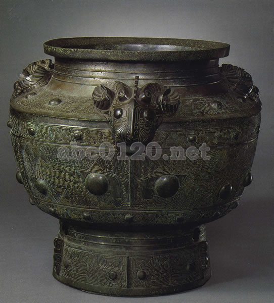 三羊尊は酒をいれる容器である。この作品は現在のところ中国で発見された同類の器物の中で最大のものである。この尊は、口が大きく肩も広く、厚い口縁は外向きに開いている。すぼまった頚の部分には、3本の凸弦文がある。肩部には等間隔に三つの羊頭が装飾され、その間を雷文を地文様とした目の形の文様で飾っている。胴部は大きく膨らんで最大径は61cmあり、文様は華やかな美しさをもっている。雷文上には3組の獣面文が見え、獣面には誇張されて飛び出した目が迫真的に表わされているが、器の荘重な雰囲気を高める効果をあげている。圏足(脚部)は高く、およそ全体の4分の1を占め、上部に2本の凸弦文をめぐらし、中間には等間隔に三つの大きな円形の穴があり、圏足下部の雷文上には6組の獣面文が飾られ、さらに肩部の三羊頭に対して交互の位置に板状の飾りがある。器全体の文様配置は複雑に入り組んでいるが、乱れたところはない。この青銅尊は、2回の鋳造を経て作られている。まず尊の本体を鋳造し、この段階で肩部のしかるべき位置にあらかじめ穴をあけておく。その後穴の位置に陶製の鋳型をしつらえ、羊頭を鋳造する。尊には現在でもはっきりと羊頭と尊の境界が不規則に肩の文様を覆っているのを見ることができ、尊の内側には、羊頭を鋳造した時に穴からあふれ出た銅の塊が見える。これは当時の鋳造技術がすでに非常に高いレベルに達していたことを物語っている。大きく開いた口部、広い肩部、低い器形、三つの大きな穴をもつ高い圏足という形式、そして複雑で過剰ともいえる文様表現から、この三羊尊は商代後期の紀元前13世紀頃に製作されたものと考えられる。出所:北京・故宮博物館名宝展-紫禁城と中国4000年の美の秘宝