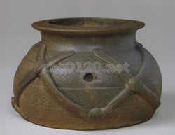 鐔縁(口縁部を外側に折り曲げた形)で頸部は短くやや締まり、なで肩で胴部は丸味があり、底は平底で内側にくぼむ。素地は灰白色で内外全面に青磁釉がかかる。胴部には紐や鋲の形を粘土で作って貼り付け、籐を編んだ魚寵を補強する皮紐や鋲が表わされている。壺の口部の上面には帯状に編目状の印文が一めぐりし、肩部、胴部にも3区にわたって帯状に編目状の印文が押されている。胴部には等間隔に四つの丸い穴がある。斬新な造形であり文様も明快で、時代の特徴がよくあらわれている。出所:北京・故宮博物館名宝展-紫禁城と中国4000年の美の秘宝