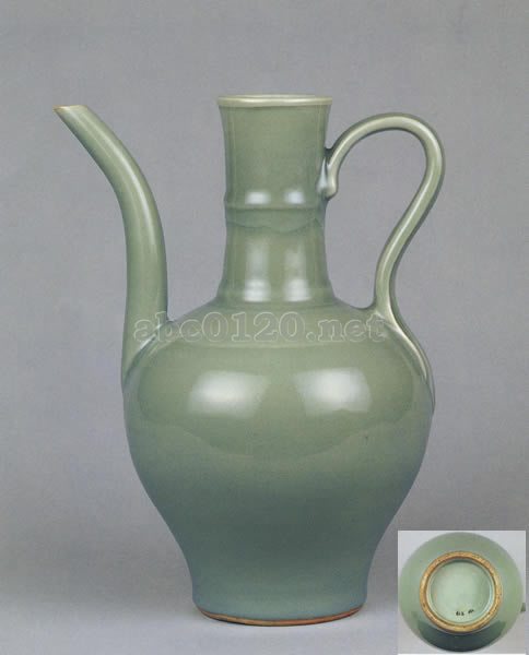 ふっくらと張った胴にすぼんだ裾部、筒形の頸、長く伸びた注口と大きく曲がった把手をつけた金属器を模倣した形の水注。把手は平たく下端が三本に分かれて胴部につく。縁を削って整えた高台畳付きは無釉のため赤褐色に呈色している。これは龍泉窯によく見られる特性で、胎土は少量の鉄を含むため無釉の場合は焼成の加減により赤褐色に焼ける。灰白色の胎に淡い灰青緑色の釉が薄くかかり、頸の圏線と肩の浅い線だけが無文の器に変化を与えている。この水注と同じ形をしたイスラム製ガラス製品や金属工芸品があるが、これらは唐時代の頃から中国でも知られていた。出所:中国陶磁の至宝-デイヴィッド・コレクション