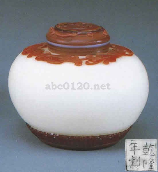 球形の壺で、被せガラスには蓮弁文の縁取りがなされ、頸には霊芝雲(吉祥文の一種)と、三匹の雨竜の縁取りがある。蓋は全体に赤茶色で、雨竜が彫られている。底には「乾隆年製」銘が太枠の中に刻まれている。出所:清朝のガラス1644-1911R・Hクラーグ・コレクションサントリー美術館