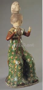 顔は白く塗られ、現状では目鼻立ちがおぼろげであるが、目や眉、唇などには、もともと彩色がほどこされ、端麗な表情が形作られていたはずである。頭髪には墨彩がみえ、両手先には白釉がかけられるというように、各部の質感の違いにも気配りがはらわれている。緑・白・褐釉が鮮やかな対比をなす衣は、花文があしらわれて華やかに飾られ、肉身の軟らかな起伏にあわせて流麗な曲面を形成している。装いや、宝相華文で装飾された豪華な榻の仕立てなどからすると、単なる仕女ではなく、高貴な女性を表現したものであろう。