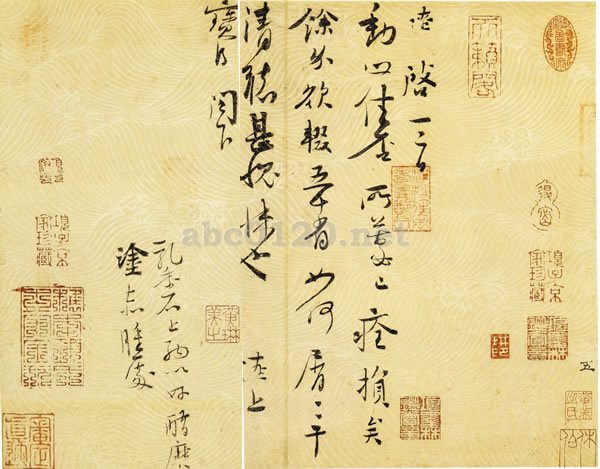 この帖は、沈遼(一〇三二-一〇八五)が友人の病状を尋ねた行書の尺牘で、その治療法についても書き及んでいる。その書法は自由な書きぶりながら格調高い豊かさを感じさせる。潤渇の調和がとれた行草書は、王羲之(三四四~三八八)の書法より得たもので、伝世の甚だ少ない沈遼の作品である。明の鄭氏、黄琳、項子京等の収蔵印が押されていることから、かつて、浙江の収蔵家である鄭氏、黄琳、項元汴の手を経たものであることが分かる。この帖に使用された水波文箋は砑花箋といい、落花流水の図柄で、北宋期における造紙工芸技術の高さをうかがわせるものである。出所:書の至宝-日本と中国2006