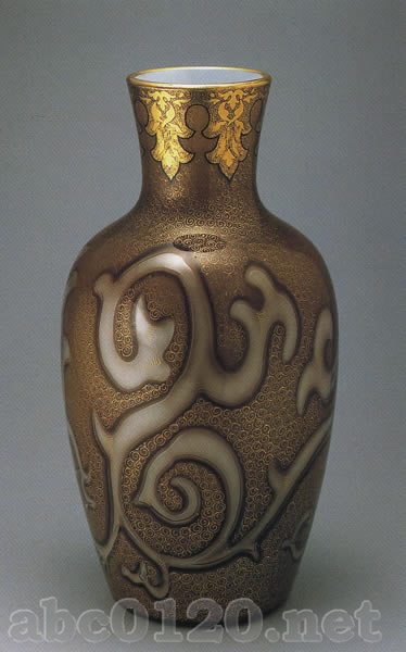 "オクトパス"ガラス、白オパール,茶と無色の被せガラス,気泡装飾、エナメル形、金彩。"ォクトパス(蛸)″ガラスはレッツ・ガラスエ房の得意の専門分野で,1887年に特許を得ている。また,このガラスは1889年のパリ万国博覧会で注目を集め,レッツ工房はグランプリを獲得した。出所:『ボヘミアのアールヌーヴォーグラス展』 Bohemian Art Nouveau Glass
