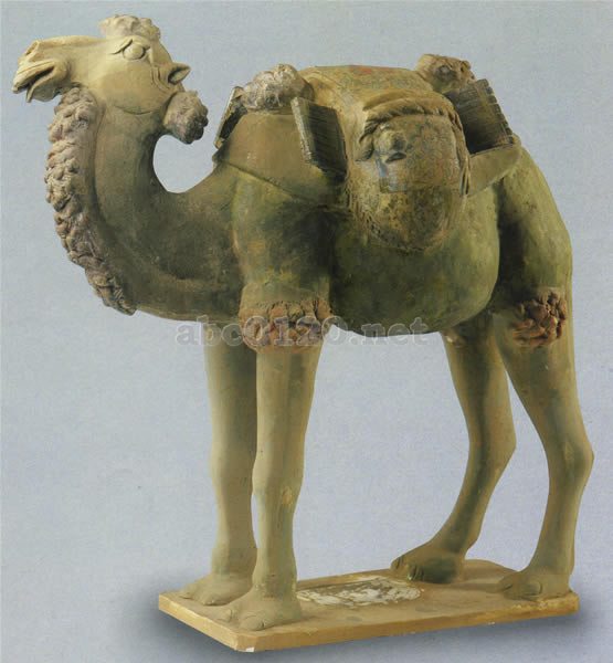 砂漠の舟といわれる駱駝はシルクロードに欠かせぬ輸送手段であった。この駱駝の背に載せられた軟らかい包みは、中国で産出した絹であり、駱駝は険しい山嶺、広漠たる砂漠を越える身仕度をして、一歩一歩西アジアに向かって歩んで行く。駱駝は古代の東西文化の交流と貿易上の相互交換のために、大きく貢献をなした。この駱駝はそうした史実を物語っている。