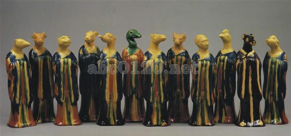 十ニ生肖は十二属相とも称し、中国の伝統的な干支紀年と関連する。戦国時代に起源し隋唐の時代に盛行した。古代の術数家は12種の動物を十二地支に割り振って、子は鼠、丑は牛、寅は虎、卯は兎、辰は龍、巳は蛇、午は馬、未は羊、申は猿、酉は鶏、戌は犬、亥は猪とした。後世の人々が、人が生まれた年の動物に似ると考えるようになったのはこれと関連するかもしれない。十二生肖俑は、墓の中で、災厄を除く役割を果し、死者の霊を守る。この1組の十二生肖俑は、頭は12種類の動物の頭に、胴体は人身に表現されている。朝服を着て手を組んで立っている。神秘的な作りである。出所:中国陝西省文物展悠久の遺産1987