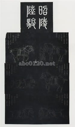 この碑は北宋元祐4年(1089年)、遊師雄が陝西省札泉県の県城(現在の札泉県駿馬郷旧県村)に建立したものである。碑石には、六駿の名称、毛色の特徴、戦功をたてた戦役と太宗の六駿を賞讃する文章が記録されている。陰刻線画の手法で六駿を縮小して表現し、細部に至るまで描写されている。六駿を研究するのに重要な資料である。出所:中国陝西省文物展悠久の遺産1987