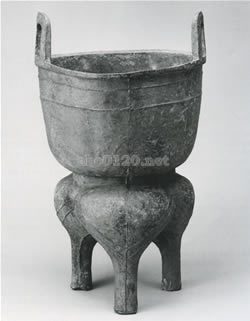 獻とは、下半の三足の鬲と上半の甑(せいろう)を合体した穀類の蒸器のことである。通常は、中央のくびれた部分に、蝶番で可動式になり、小孔の開けられた中蓋((竹+田+丌)という)がついていて、下部から水蒸気が吹き上げられる構造になっているが、当器の場合は、なぜか中蓋の付けられていた痕跡がない。下半に比して上半が大きく、殷代後期の様式である。口縁の下と、足部とに、凸弦紋を有し、古朴であるとともに実用的である。出所:中国の器展ー青銅と陶器