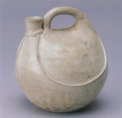 もともとは皮で作られた袋で、酒や水、山羊の乳などを貯えたものであったが、これを陶器で作るようになったのは遼時代のことである。この鶏冠壺にも、皮を縫い合せた筋目をあらわす凸帯が、注口の付根や胴部にみられる。胴が丸く紐状の柄のある器形は、遼代の鶏冠壺の早い時期に属する形式とされていろ。胎土は白色できめが細かく、高火度で硬く焼成されている。総体に施された白釉はマット状で、底には「官」字銘がある。遼時代の官窯であった缸瓦窯の製品と思われる。出所:中国の器展ー青銅と陶器