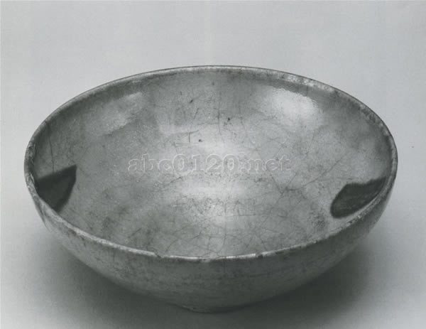 口をわずかにかかえ込んだ形の深目の鉢で小さな高台がつく。高台も太く作られ、畳付は平らに削られている。胎土は粗く黄白色を呈し、低火度でやわらかく焼成されている。内外ともに澱青釉がたっぷりとかかり、高台は露胎である。釉は失透性で、見込み側面の二方に紅斑がみられる。マット状の釉調で一部に焼成時の灰が付着している。出所:中国の器展ー青銅と陶器