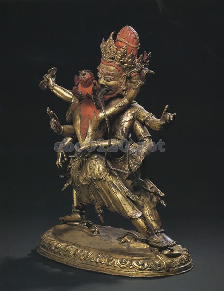 強烈なエネルギーが、この合体像から浸出し、放射される。恐ろしくかつエロチックな姿の三面六臂の金剛手は、主にナーガ(地中や海底にいる蛇のような龍)の調伏と関連づけられる。妃は一面二臂であとは金剛手とほぼ同じ姿である。神妃を抱擁する「父母仏(ヤプュム)」の形であらわされる。女尊の右足は男尊の左足にかけて、左足は男尊の左足の甲に置く。両者は舞踏のバランスをとりながら、荒々しい龍の無知と悪をあらわす人物像を踏みつけている。この作品は形が非常に複雑だが、二尊は見事にバランスよく調和を保ち、ダイナミックな動感が全体にみちている。手足と体が均衡を保ち力を発散している。かたいけれども力強い動きのある腰衣や天衣、瓔珞や金剛手の口や耳から出る蛇は、像の迫力と強烈さをさらに強める。