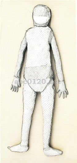 直径0.5皿を網い銀糸で編んだ特別な葬衣である。人体の各部分に分けて編み、それを死者の下着の上から着せ、細い銀糸で各部位を繋ぎあわせた。この銀糸網は頭、腕、手、胸と背中、腹、足の7つの部分からなっている。銀糸網の上にさらに錦の衣を首せ、ベルトを付け、黄金のマスクで覆い、銀靴を履かせ、最後に沢山の装身具で全身を飾った。