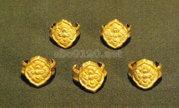 遼時代 1986年内蒙古自治区のチェリムモン盟陳国公主墓出土 金製 径1.9cm、重さは1.4~2.4g各々異なる。 薄い金片を型打ちしたもの。正面には四弁の花が打ち出されている。それぞれ公主と蕭公の両手の指に付けられていた。出所:北方騎馬民族の「黄金マスク展」 関連用語: