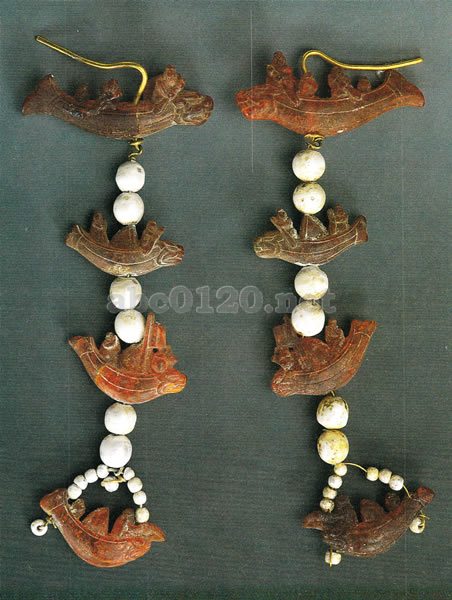 琥珀と真珠を交互に細い金糸で繋いでいる。琥珀は龍頭の魚形をしており、船に見立てられている。船の上には、帆、魚篭、さらに船を漕ぐ人、魚を取る人の姿まで刻まれている。出所:北方騎馬民族の「黄金マスク展」