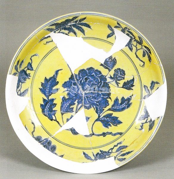 この器は、器形、装飾ともに白磁褐彩牡丹文盤と同一である。ひとつ異なる点は、鉄絵と青花の相違と、釉上に低火度黄釉が塗りつめられている点である。青花に黄彩を加えるこの装飾技法は宣徳期に始まるものである。出所:皇帝の磁器-新発見の景徳鎮官窯