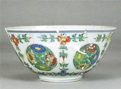 外壁は、「工」字形の葉文によって器面を六区画に分け、間に紅・黄・藍彩の菊団花文を描き入れている。見込みには団花文を配す。底裏には、青花の六字の二重方圈銘があったと考えられる,この器の構図は、成化期に新しく作られたものと言える。 出所:皇帝の磁器-新発見の景徳鎮官窯