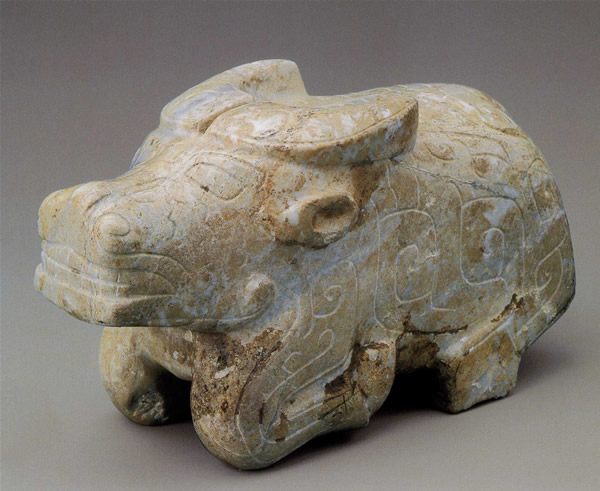 臥した水牛の姿を表わすっ目を見開き、歯をむき出しにしている。全身に彫られた渦文は、この水牛が霊気を発する神聖な存在であることを示している。材質は大理石と報告されているが、よく磨かれて美しい艶がでている。