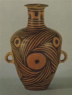この両耳壺は水を入れるもの。泥質紅陶。長頸は手で持ちやすく,腹部の両耳は,繩を結んで水を汲んだり,傾けて注ぐのに便利にできている。古代の陶工の知恵がみられる。装飾図案の旋渦文は原始社会の黄河流域の人々が奔騰する急流を芸術的に表現したもの。優美な造形,流れるような線條は工芸のきわめて高い完成度を示している。出所:『中華人民共和国出土文物展1977』