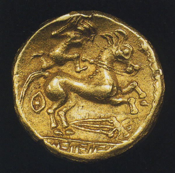 四分の一スタテール。表:右向きの人物頭部。月桂冠を着ける。首の下に剣。裏:右向きの馬の上に御者が飛び乗る。馬の下に簡略化された人の形の柄の剣。馬の後ろに小さな盾。地面を表す線の下に銘の名残り。出所:「古代ヨーロッパの至宝-ゲルト美術展1998」