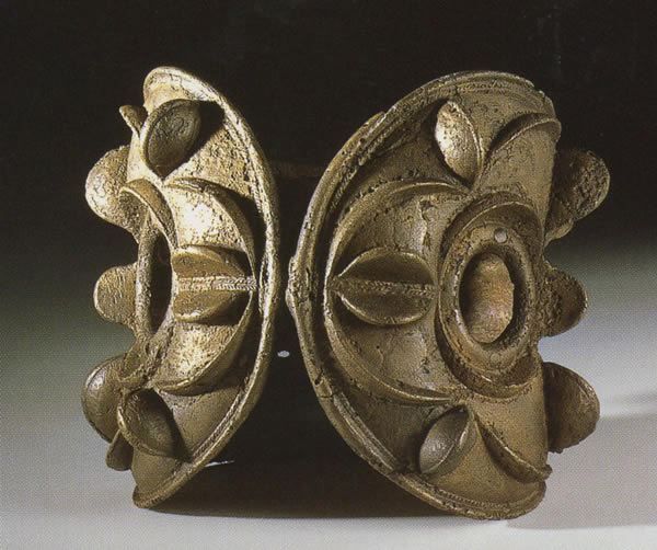全体を高浮彫で装飾し、輪の部分は水平に三つに区画し、両端の楕円形の穴には当初はエマーユを留めていた。 1857年以前に発見された。「ずっしりした(massive)」と呼ばれるこの種の腕輪は、おそらく木製の神像のためのもので、ブリテン島の南部がローマの支配下にあった時代にその領域外で制作され続けた。出所:「古代ヨーロッパの至宝-ゲルト美術展1998」